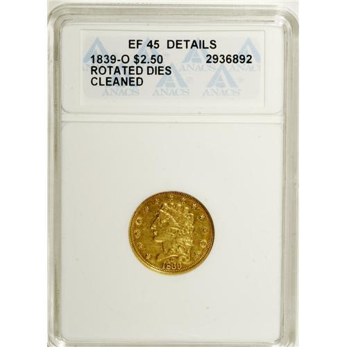 <B>1839-O $2 1/2 --Rotated Dies, Cleaned--ANACS. XF45 Details.</B></I> Low Date, Close Fraction, Breen-6153, McCloskey-B, R.4. The dies have medal turn, which suggests inexperience on the part of the New Orleans Mint press operators. A hairlined but acceptable golden-tan piece that is bold for the XF45 Details grade.<BR><BR><b>Shipping:</b> Coins & Currency (<a target="_blank" href="http://www.heritageauctions.com/common/shipping.php">view shipping information</a>)