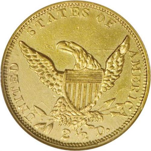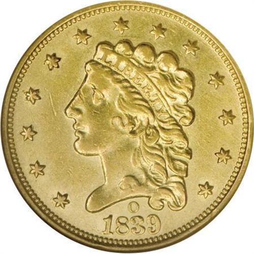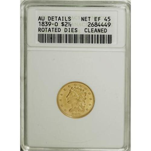 <B>1839-O $2 1/2 --Cleaned--ANACS. AU Details, Net XF45. Rotated Dies.</B></I> Low Date, Close Fraction, Breen-6153, McCloskey-B, R.4. This variety is sometimes seen from inverted dies, or medallic alignment as it is more properly termed. The reverse die is also shattered with several plain die cracks in the fields. Light greenish-yellow surfaces exhibit some minor hairlines, although the overall appearance is still pleasing to the eye.<BR><BR><B>Coin Engraver:</B> William Kneass<BR><BR><b>Shipping:</b> Coins & Currency (<a target="_blank" href="http://www.heritageauctions.com/common/shipping.php">view shipping information</a>)