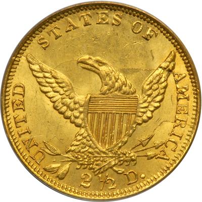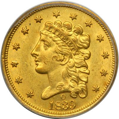 1839-O $2.50 Classic Head. PCGS graded MS-63. A well struck frosty mint example in natural greenish color gold. An extremely significant coin in this grade, and certainly one of the very finest known of this date. Condition Census. Identifiable by a tiny v-shaped scuff in the frost of the cheek by the lips. A scant 17,781 quarter eagles of the Classic Head Type were coined in New Orleans during 1839, all bearing the obverse Mintmark above the date. This particular one was saved in very choice Mint State condition, and somehow came down through the decades and generations virtually undiminished from the day it was coined. Note the satiny luster on both sides, with splendid surfaces that show virtually no significant signs of handling. There is a die crack through the I of UNITED down through the upper disconnected leaf pair, and touching one claw point, then down to the rim through the first 2 in the denomination. Another crack up above joins the left wing, beak and right wing.