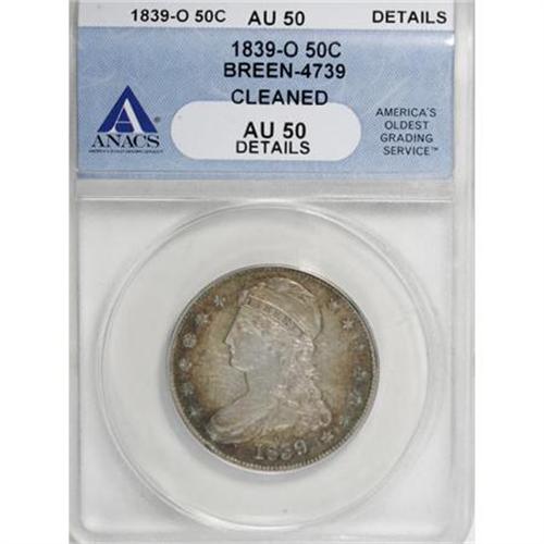 <B>1839-O 50C --Cleaned--ANACS. AU50 Details.</B></I> Breen-4739. The mintmark is repunched south, as usually seen. Golden-brown, ruby-red, and ocean-blue toning embraces the borders. Well struck, but the obverse has light horizontal hairlines. The only affordable New Orleans issue of the Capped Bust design.<BR><BR><B>Coin Engraver:</B> Christian Gobrecht<BR><BR><b>Shipping:</b> Coins & Currency (<a target="_blank" href="http://www.heritageauctions.com/common/shipping.php">view shipping information</a>)