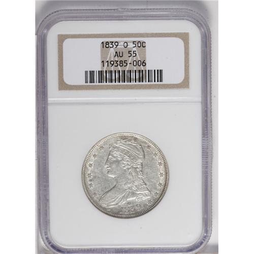 <B>1839-O 50C AU55 NGC.</B></I> Breen-4739. The repunched mintmark variety, here in a late die stage with numerous heavy cracks across both borders. This nearly untoned piece is pleasing aside from a faint pinscratch from the rim at 3 o'clock through the neck.<BR><I>From The Jones Beach Collection.</B></I><BR><BR><b>Shipping:</b> Coin/Currency (<a target="_blank" href="http://www.heritageauctions.com/common/shipping.php">view shipping information</a>)