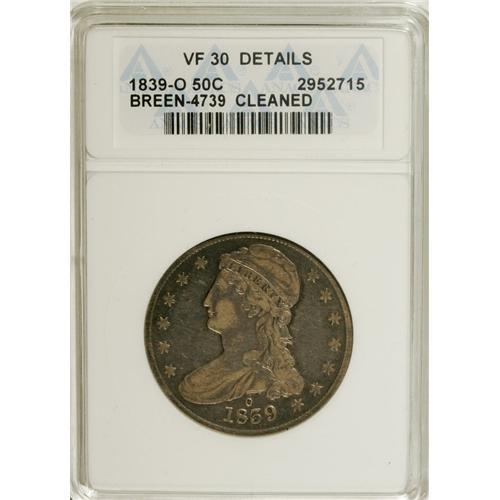 <B>1839-O 50C --Cleaned--ANACS. VF30 Details.</B></I> Breen-4739. NGC Census: (17/185). PCGS Population (6/178). Mintage: 178,976. Numismedia Wsl. Price: $390. (#6181)<BR><BR><b>Shipping:</b> Coins & Currency (<a target="_blank" href="http://www.heritageauctions.com/common/shipping.php">view shipping information</a>)