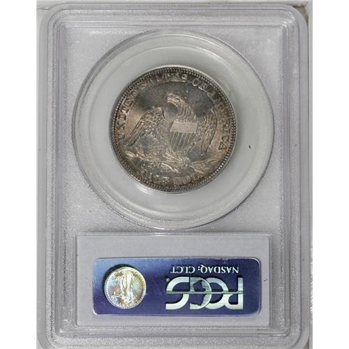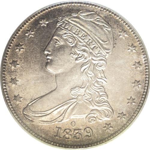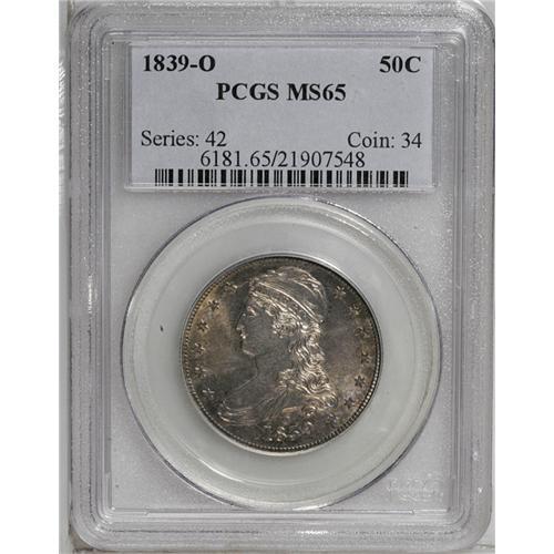 <B>1839-O<50C> MS65 PCGS.</B></I> Doubled Mintmark. This is the first regular issue half dollar struck in New Orleans, and the only collectible date of the Capped Bust design from this Mint. The 1838-O issue has the distinction of being the true first issue, but less than 20 examples of that date are known. Like the Classic Head gold coins and the 1839-C and D half eagles, the mintmark is located above the date on the obverse.<BR> The New Orleans Mint was authorized by Congress in 1835, in the same legislation that also authorized the branch Mints at Charlotte and Dahlonega. All three facilities were designed by William Strickland and had a similar physical appearance. Earlier, Strickland had designed the second Philadelphia Mint. In 1839 at the New Orleans Mint, Joseph Kennedy was beginning his service as the second Mint Superintendent and John Leonard Riddell was beginning his service as the melter and refiner. Although coinage operations began in March 1838, the building was not completely finished until 1839.<BR> The mintage of half dollars in 1839 totaled 178,976 coins, utilizing three obverse and five reverse dies. Today, only three die varieties are known. This example, a magnificent Gem, shows numerous obverse and reverse die cracks. The design elements are nicely defined, with only the tip of the drapery and a few stars showing weakness. Both sides are highly lustrous with excellent aesthetic appeal. Satiny surfaces are graced by light gold and iridescent toning.