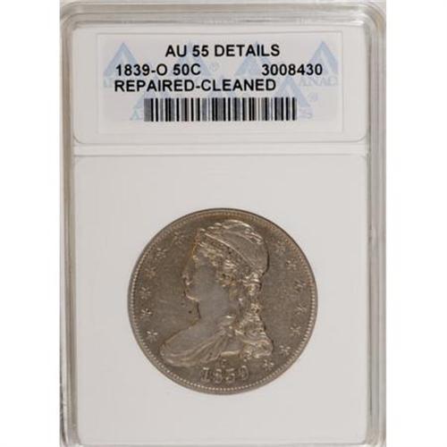 <B>1839-O 50C --Repaired, Cleaned--ANACS. AU55 Details.</B></I> Despite impairments that include uniform luster from a past cleaning and evidence of smoothing on Liberty's neck, this remains a briefly circulated and desirable example of an elusive O-mint half dollar issue. Pink and peach patina predominates.<BR><BR><B>Coin Engraver:</B> Christian Gobrecht<BR><BR><b>Shipping:</b> Coins & Currency (<a target="_blank" href="http://www.heritageauctions.com/common/shipping.php">view shipping information</a>)