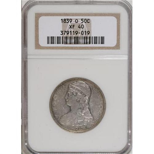 <B>1839-O 50C XF40 NGC.</B></I> This is the only collectible Reeded Edge half dollar issue from the New Orleans Mint. The 1838-O half dollar is excessively rare, and fewer than 20 pieces are known. This is a later die state, with spindly die cracks on each side, one of heaviest of which extends through all four numerals in the date. Evenly worn with few marks and pearl-gray surfaces that display a small degree of tan coloration near the peripheral regions.<BR><I>From The Casa Becca del Norté Collection.</B></I><BR><BR><B>Coin Engraver:</B> Christian Gobrecht<BR><BR><b>Shipping:</b> Coins & Currency (<a target="_blank" href="http://www.heritageauctions.com/common/shipping.php">view shipping information</a>)