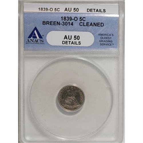 <B>1839-O H10C No Drapery--Cleaned--ANACS. AU50 Details.</B></I> Breen-3014. NGC Census: (2/52). PCGS Population (2/38). Mintage: 1,000,000. Numismedia Wsl. Price for NGC/PCGS coin in AU50: $175. (#4320)<BR><I>From The Al Blythe Collection of Half Dimes.</B></I><BR><BR><B>Coin Engraver:</B> Christian Gobrecht<BR><BR><b>Shipping:</b> Coins & Currency (<a target="_blank" href="http://www.heritageauctions.com/common/shipping.php">view shipping information</a>)