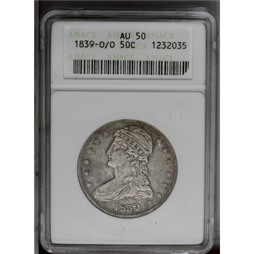 <B>1839-O/O<50C> AU50 ANACS.</B></I> Repunched mintmark. A popular issue, as this is the last year of the Capped Bust half dollar and the only year this type was struck at a branch mint for general circulation. Evenly worn, its smooth gray surfaces show traces of dappled purple-brown color around the peripheries. A couple of pinscratches are noted behind and above the eagle's head. <BR><BR><B>Important notice:</B> Heritage usually auctions material at the rate of 200-250 lots per hour. On some occasions eBay Live bid software or the Internet may not be able to keep up with the pace of the auction. We recommend placing a realistic absentee bid now as insurance to avoid disappointment. Occasionally the auctioneer may eliminate or reject an eBay Live bid, and the auctioneer may also reopen a lot after the close of the eBay live bidding (usually because we missed an audience bid), and may reject your bid even if it shows you as the winning bidder. By bidding via eBay Live, you agree that Heritage may award the lot to another bidder at its sole discretion under the circumstances described above or any other reasonable circumstances. Since eBay bids are not shown to us until we open the lot on the floor, we treat those bids just like floor bids. In most cases the floor responds before the eBay bid is presented to us, due to Internet lag time, so for consistency we have made it a policy that floor bids are always considered first over tie eBay live bids. Also please note that all Heritage lots purchased through eBay Live carry a 20% Buyer's Premium. Please make sure you read the Terms and Conditions before you bid. This lot is being auctioned in conjunction with a live floor auction by Heritage Galleries & Auctioneers. All final auction and invoice information will be supplied by Heritage Galleries & Auctioneers, and all other information should be considered preliminary. Lot:1980 <BR><BR><B>Winning Notification and Billing:</B> After the FINAL session in this auction is complete, Heritage will send e-mail and snail mail invoices. This process normally takes several days. All final auction and invoice information will be supplied by Heritage Galleries & Auctioneers, and all other information should be considered preliminary. <BR><BR>This auction will be conducted on a live auction floor and over the Internet through eBay Live. If you choose to place an absentee bid, please take a moment to <font color='#0000ff'><u><a href='http://pages.ebay.com/liveauctions/help/before/laabsentee.html'>learn how eBay Live absentee bidding works</a></u></font><font color='#000000'>