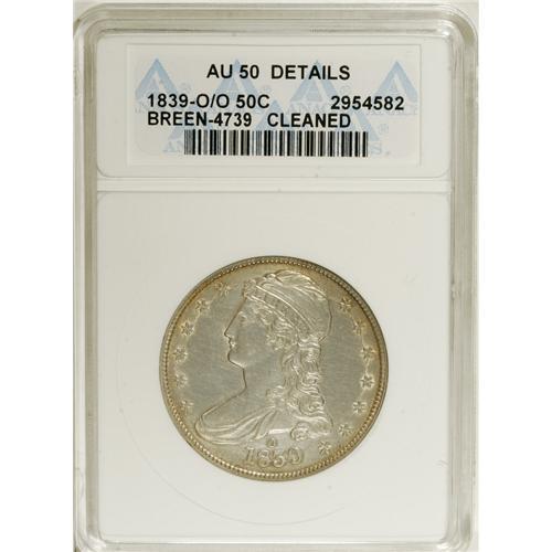 <B>1839-O/O 50C --Cleaned--ANACS. AU50 Details.</B></I> Breen-4739. The mintmark is lightly but widely repunched south. The long in use die pair features an extensive network of cracks. Light golden-gray toning deepens along the obverse border. The obverse is hairlined, but the piece retains considerable luster.<BR><I>From The Hoosier Discovery Collection.</B></I><BR><BR><b>Shipping:</b> Coins & Currency (<a target="_blank" href="http://www.heritageauctions.com/common/shipping.php">view shipping information</a>)