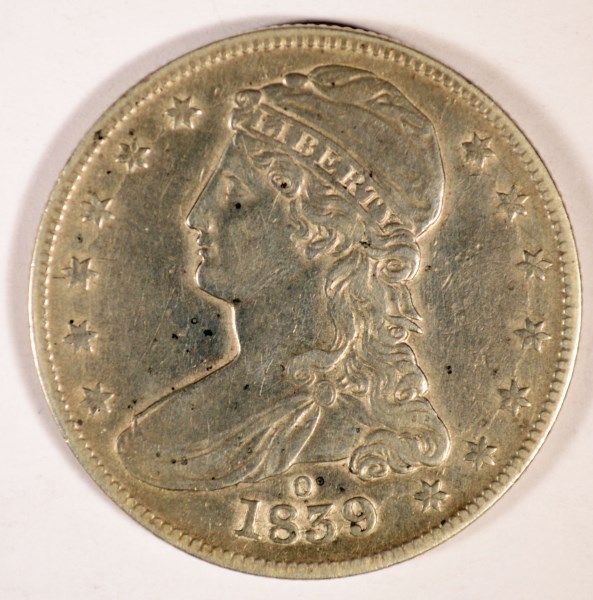 1839-O REEDED EDGE HALF DOLLAR, XF/AU 45 VERY RARE, LOW MINTAGE
