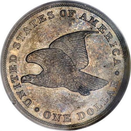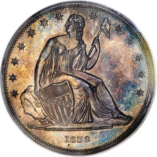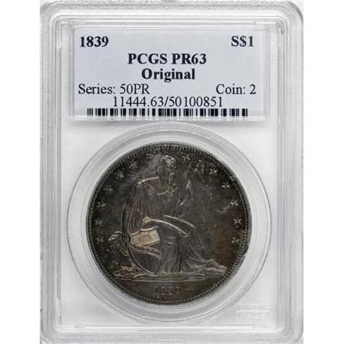 <B>1839 P$1 Name Removed, Judd-104 Original, Pollock-116, R.3, PR63 PCGS.</B></I> Silver. Reeded Edge. Die Alignment IV, "original" issue of 1839. The head of Liberty is nearly opposite the F in OF, and therefore is in Die Alignment IV orientation. This coin has been identified by PCGS as an "original"; that is, a coin that was made in 1839. This new classification methodology adopted by PCGS is consistent with the latest information published in the Red Book. However, not all Die Alignment IV coins are originals, but all originals are in Die Alignment IV. Those coins that exhibit a microscopic die break through the top of MERI are normally associated with restrikes (including both Die Alignment III and IV coins). Likewise, those coins in Die Alignment IV with a perfect (uncracked) reverse die are believed to be the originals from 1839 (and are usually found in low grades). <BR> Only 300 1839 dollars were reported to have been made in 1839, and an unknown number of restrikes were struck after 1857 to meet collector demand at that time. All of the 1839 dollars made in 1839 are thought to have been deposited into the U.S. banking system. Therefore, by default, the Gobrecht dollars issued 1839 dollars are regular issued coins (even though they were struck in proof format). As previously noted, all Gobrecht dollars are assigned Judd numbers, suggesting that these coins are patterns. However, this conclusion is not correct. In fact, the Gobrecht dollars made in 1836, 1837, and 1839 are regular-issued coins, and therefore are not patterns. Nevertheless, for historical reasons, it appears that these coins will continue to be incorrectly identified as patterns. The only real Gobrecht dollar pattern coins are the Judd-58 (Name Below Base) and the Judd-84 (1838 dollar). Gobrecht dollars represent a short, three-year series, with two different "types" of coins. The first type consists of the issue of 1836 with the no-star obverse design, and the second type includes the 1838 and 1839 dollars with obverse stars but no reverse stars. Another interesting observation is that Gobrecht dollars are the only proof coins intentionally made for general distribution. <BR> Gobrecht dollars are one of the most fascinating and yet confusing series of silver dollars ever made by the U.S. Mint. Since only a small number of 1839 dollars exist today, very few coin collectors will ever own an 1839 Gobrecht dollar. The present coin is attractively toned on both sides with subtle gray, golden, and lilac iridescence and strong reflectivity in the fields. The devices also exhibit a full strike on each side, including full definition on Liberty's foot. The current coin certainty represents a high grade example that should please most collectors and fit nicely into any high grade collection that includes U.S. dollars.<BR><I>From The Madison Collection.</B></I><BR><BR><b>Shipping:</b> Coins & Currency (<a target="_blank" href="http://www.heritageauctions.com/common/shipping.php">view shipping information</a>)