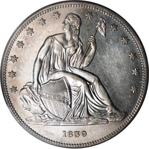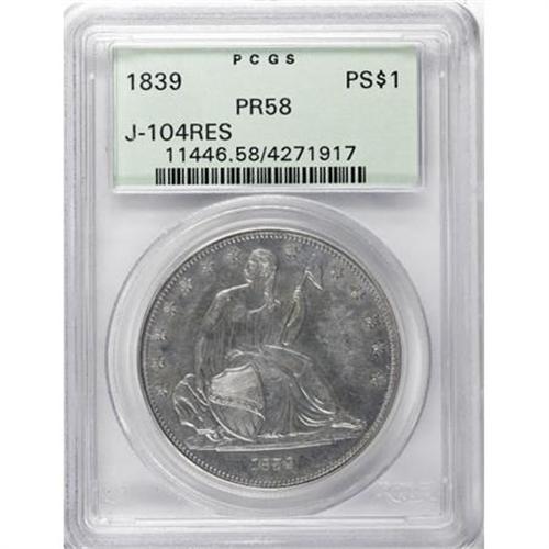 <B>1839 P$1 Name Effaced, Judd-104 Restrike, Pollock-116, R.3, PR58 PCGS.</B></I> Silver. Die Alignment IV (medallic turn, center of Liberty's head opposite right side of F in OF). The restrike dollars from 1839 are believed to have been struck between 1857 and 1859. All were struck in Die Alignment IV and show a microscopic die crack at the top of MERI. As restrikes, these pieces are generally found in higher grades. This coin shows just the slightest friction over the highpoints of the design and in the fields. Mostly brilliant, there is a slight accent of golden color around the obverse periphery. <BR><BR><b>Shipping:</b> Coins & Currency (<a target="_blank" href="http://www.heritageauctions.com/common/shipping.php">view shipping information</a>)