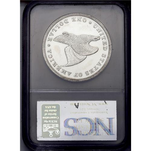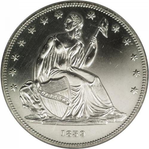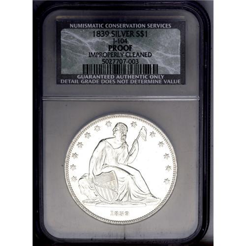 <B>1839<PS$1> Name Omitted, Judd-104 Restrike, Pollock-116, R.3--Improperly Cleaned--NCS. Proof.</B></I> Die Alignment IV. The head of Liberty is opposite the right side of the F in OF, with the eagle flying level after a medallic turn. The restrikes of 1839 are distinguished by the presence of fine reverse die cracks, especially through MERI. These pieces are believed to have been struck from 1857 through 1859. By definition, most of these restrikes were well preserved, as is this piece. The only mentionable flaw on this coin are the brightly cleaned surfaces. Generally sharply struck, except on a couple of the peripheral obverse stars. Each side is mostly brilliant with the only notable contact mark located on the neck of Liberty.<BR><I>From The Steve Glenn Collection.</B></I> <BR><BR><B>Important notice:</B> Heritage usually auctions material at the rate of 200-250 lots per hour. On some occasions eBay Live bid software or the Internet may not be able to keep up with the pace of the auction. We recommend placing a realistic absentee bid now as insurance to avoid disappointment. Occasionally the auctioneer may eliminate or reject an eBay Live bid, and the auctioneer may also reopen a lot after the close of the eBay live bidding (usually because we missed an audience bid), and may reject your bid even if it shows you as the winning bidder. By bidding via eBay Live, you agree that Heritage may award the lot to another bidder at its sole discretion under the circumstances described above or any other reasonable circumstances. Since eBay bids are not shown to us until we open the lot on the floor, we treat those bids just like floor bids. In most cases the floor responds before the eBay bid is presented to us, due to Internet lag time, so for consistency we have made it a policy that floor bids are always considered first over tie eBay live bids. Also please note that all Heritage lots purchased through eBay Live carry a 20% Buyer's Premium. Please make sure you read the Terms and Conditions before you bid. This lot is being auctioned in conjunction with a live floor auction by Heritage Galleries & Auctioneers. All final auction and invoice information will be supplied by Heritage Galleries & Auctioneers, and all other information should be considered preliminary. Lot:2164 <BR><BR><B>Winning Notification and Billing:</B> After the FINAL session in this auction is complete, Heritage will send e-mail and snail mail invoices. This process normally takes several days. All final auction and invoice information will be supplied by Heritage Galleries & Auctioneers, and all other information should be considered preliminary. <BR><BR>This auction will be conducted on a live auction floor and over the Internet through eBay Live. If you choose to place an absentee bid, please take a moment to <font color='#0000ff'><u><a href='http://pages.ebay.com/liveauctions/help/before/laabsentee.html'>learn how eBay Live absentee bidding works</a></u></font><font color='#000000'>