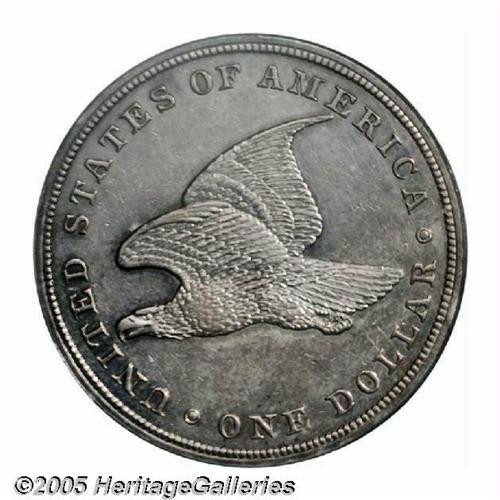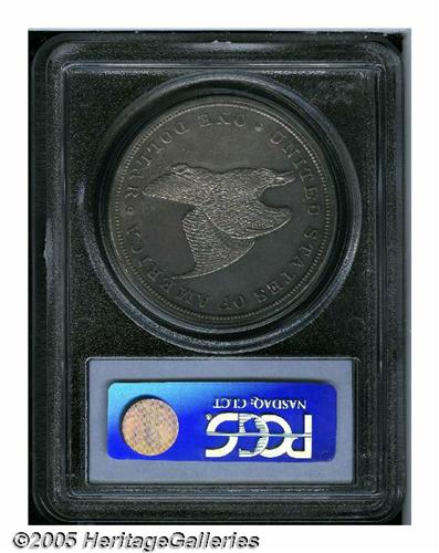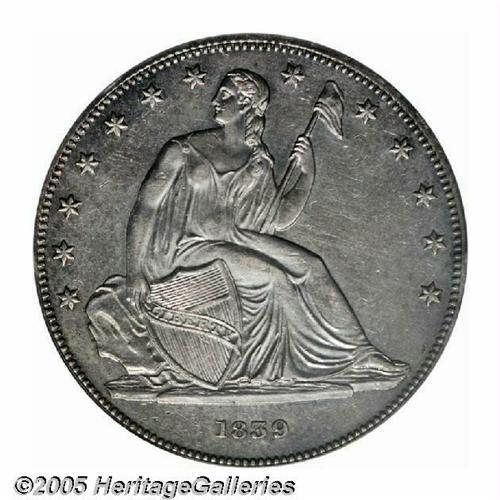 <B>1839<PS$1> Name Omitted, Judd-104 Restrike, Pollock-116, R.3, PR50 PCGS.</B></I> Silver. Die Alignment III (coin turn, eagle flying level). This and the other 1839 Gobrecht in this sale are both from Die Alignment III--a rare opportunity for the serious collector to acquire this scarcer 1839 (already a rare coin) in either PR50 or PR63 condition. This particular coin has a tremendous amount of eye appeal for the grade. There is just the slightest bit of wear over the highpoints, the fields and devices are free from any distracting marks, and each side shows a lovely intermixture of rose and lilac toning. An outstanding 1839 dollar.