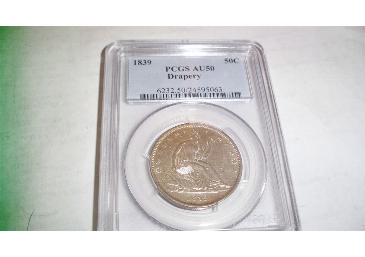 1839 SEATED LIBERTY DRAPERY SILVER HALF DOLLAR, PCGS AU-50