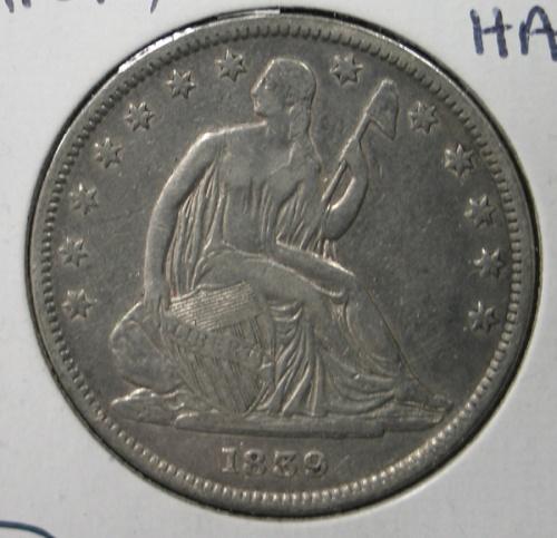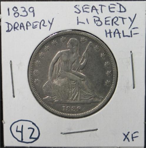 1839 SEATED LIBERTY HALF DOLLAR. With drapery. XF.