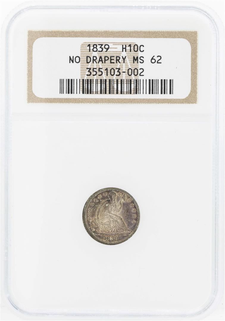 One 1839 Seated Liberty Half Dime Coin No Drapery NGC MS62. NGC Certified.