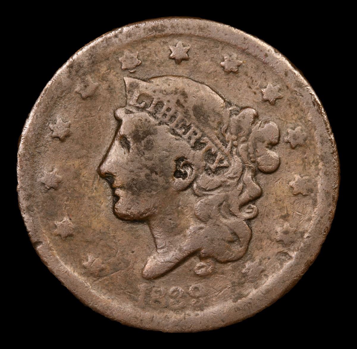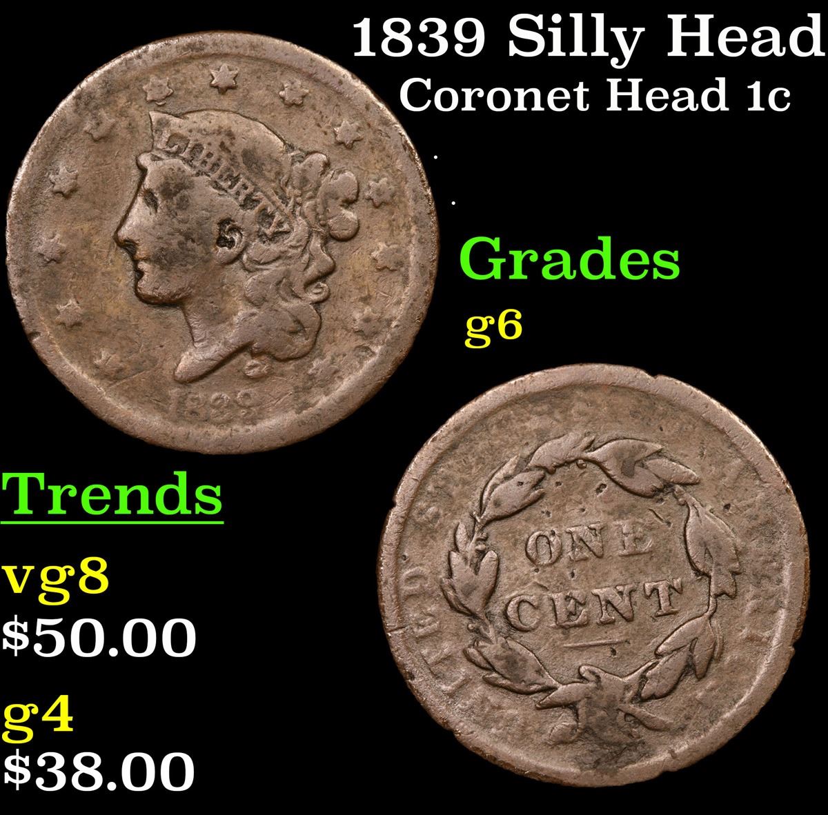1839 Silly Head Coronet Head Large Cent 1c Grades g+.