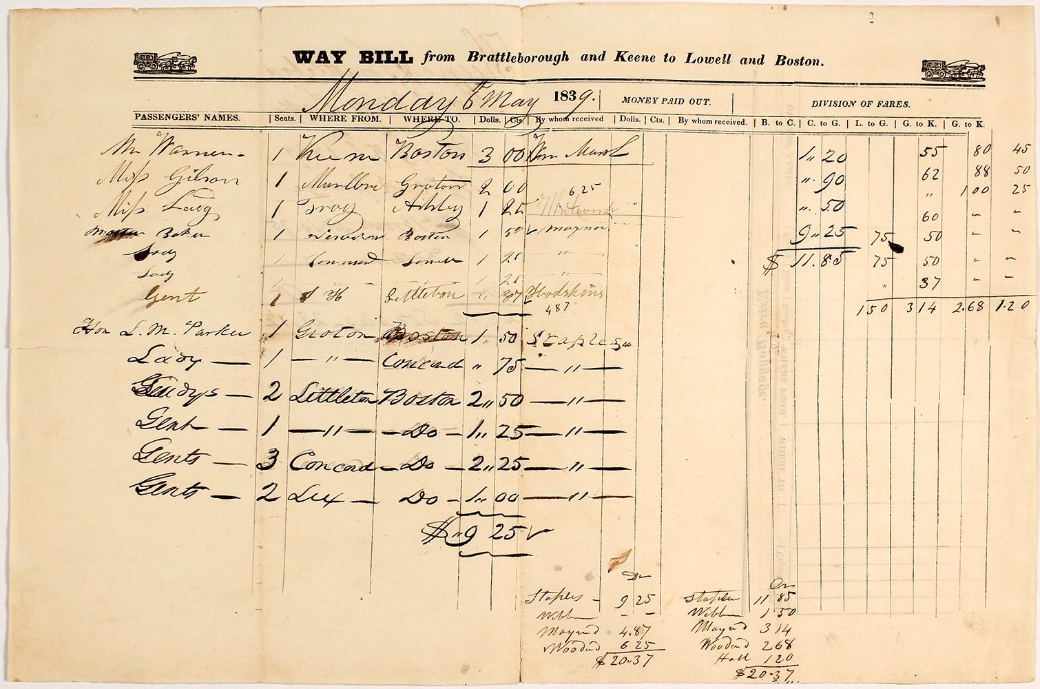 Pictorial large way bill for stage passage from Brattleborough and Keene to Lowell and Boston. Dated May 6th, 1839. Thirteen passengers, some identified only as "lady" or "gent." 10.5 x 16" with folds, soiling, and some separation. (Prag Collection) Date: Location: Massachusetts HWAC # 55602