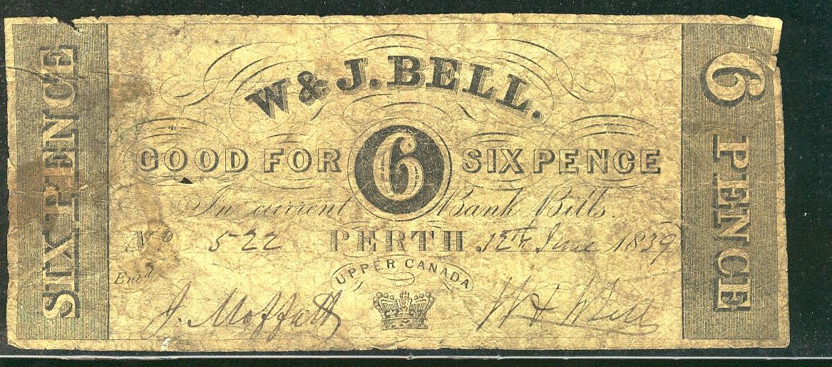 1839 W.J. Bell script. Good for 6 Six Pence, #522. Grades Good+ with tape on back.