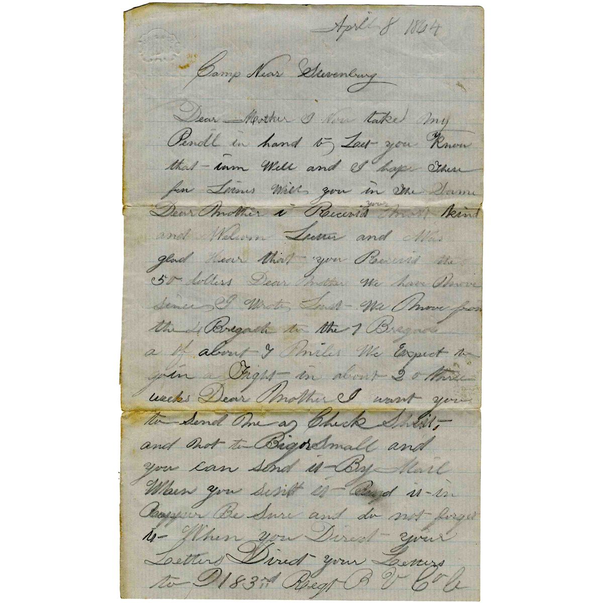 Letter from Jacob Marshall of the 183rd Pennsylvania Infantry. Written in pencil and datelined ''April 8, 1864 / Camp Near Stevenburg,'' letter reads in part: ''…I now take my pencil in hand to let you know I'm well and I hope these few lines will find you in the same. Dear Mother I received your kind and welcome letter and was glad to hear you received the 50 dollars. Dear Mother we have moved since I wrote last we have moved from the third Brigade to the 1 Brigade…of about 7 miles…we expect to join the fight in 2 or three weeks. Dear Mother I want you to send me a Check shirt and not to Big or Small and you can send it By Mail When you send it Send in wrapper be sure and do not forget to When you Direct your Letters Direct your letters to 183rd Regt PV Co C Corps 1 Divs 1 Brigade you need not put Camp Near the Rapidan But Direct it as said Dear mother I wish you could send me 5 dollars But don't forget to send me shirt I wish you to send me some postage stamps No more at present but remain your Affectionate Son…'' The 183rd Pennsylvania was engaged in battle at the Wilderness, Spotsylvania, North Anna River, Totopotomy, Cold Harbor, Deep Bottom, Petersburg and Dabney's Mill. Jacob Marshall mustered into Company C on 12 November 1863 and mustered out on 13 July 1865 at Washington D.C. Letter measures 5.5'' x 9'' and runs 2pp. Toning and chipping to edges, otherwise excellent condition.
