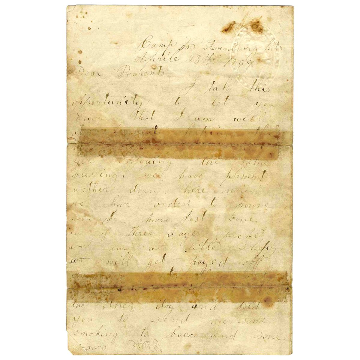 ALS from Robert M. Spense of the 183rd Pennsylvania Infantry, Company H, to his parents. Written in ink and datelined ''Camp in Stevensbury Hts / Aprile 28th 1864'' letter reads in part: ''…send me some smoking to bacoo and some cigars and some lemons and a stationary package of paper and a bottle of Jamaker ginger you can send me any think you pleas. Don't send of any thing that will spoil…there was one of our fellows by the name of champion was cleaning his musket and it went of and shot hime through the arme and the docters took of his arme some of the fellows is all the time folling with there piece it is a wonder there not more of them shot then there is. I want your photographs if you have not got the money to get it never mind it tell I acct some money and I will send some home to you…I want you to save some of it fore me to see whether I come hom a gain or not…I expect to be a march perty soon rite soon…'' Spense mustered into Company H on 21 January 1864. He died on 18 November 1864 at Chester, Pennsylvania. The 183rd Pennsylvania saw action at the Wilderness, Petersburg and Deep Bottom. 3pp. letter measures 3'' x 6''. Separation at folds inexpertly repaired with tape. Scattered foxing, otherwise very good condition.
