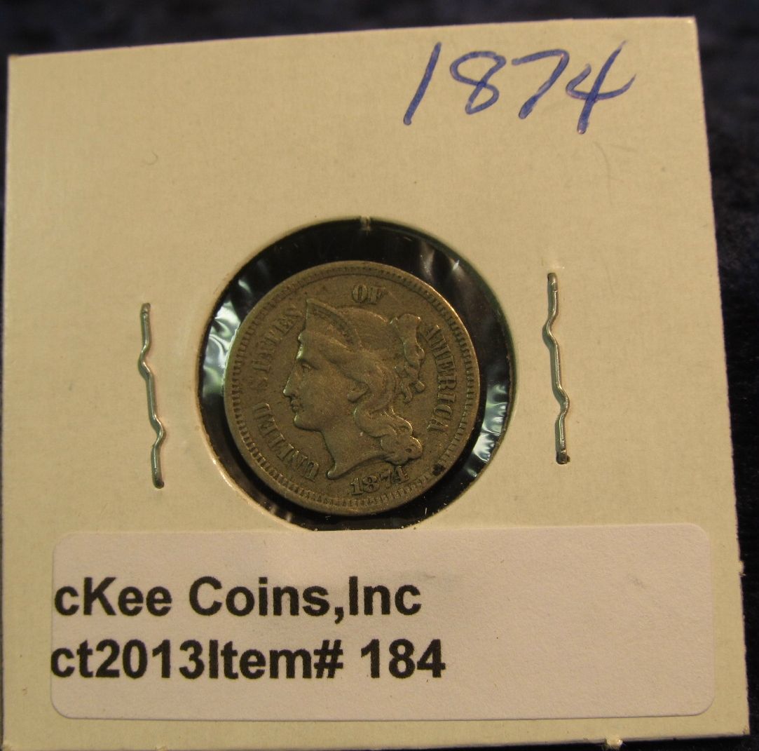 184. 1874 U.S. Three Cent Nickel. VF 20. Redbook value $28.00.