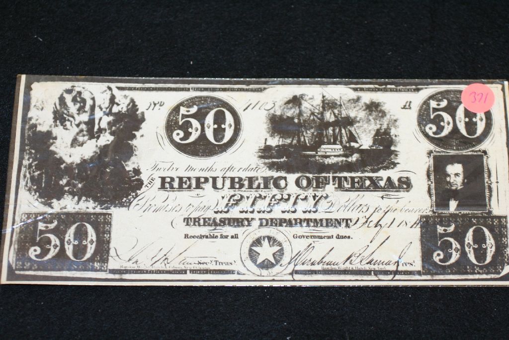 184? Republic of Texas $50 Bank Note (Copy) From Frontier Times Museum