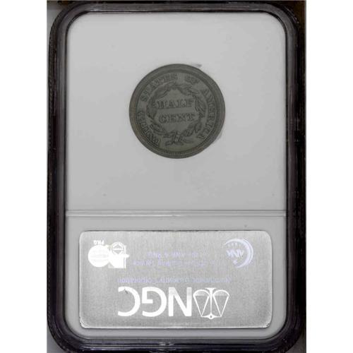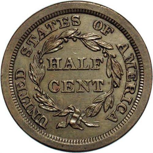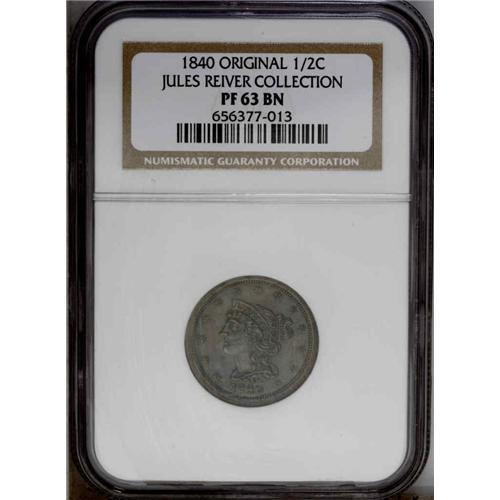 <B>1840<1/2 C> Original. PO-1, B-1, R.6. PR63 Brown NGC. PR60 EAC.</B></I> Small date; Large berries. As an Original of the 1840 issue, this attractive Proof represents the very first Braided Hair Half Cent. Jules had identified this as the plate coin in the second edition of Cohen. However, it does not appear to match the illustration. All the design details are boldly defined, including all stars and leaves. The surfaces are lightly reflective but not deeply mirrored as usual. Deep olive with hints of steel-blue color.<BR> Walter Breen delved deeply into these Proof issues of the 1840s. Although quite a bit of his writing was based on unsubstantiated commentary and assumptions that he made, the pages of his <I>Half Cent Encyclopedia</B></I> dealing with these coins are still well worth reading.<BR> Half Cents from 1840 through 1848 were not made for circulation; the limited production was intended for inclusion in Proof Sets and Presentation Sets of the period. Breen suggested that it was not coincidental that Proof Sets were first made at the Mint in 1840.<BR><I>Ex: Steve Ivy (7/1978).</B></I> Envelope Included.