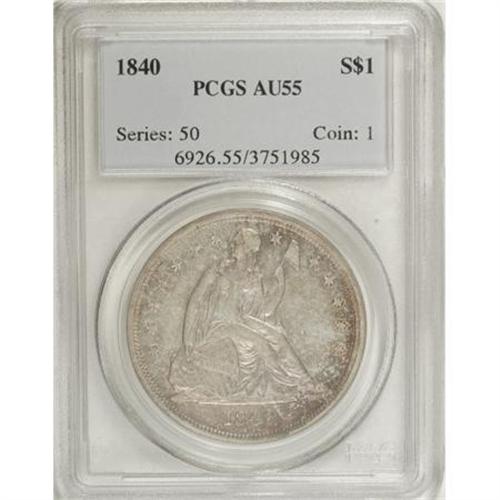 <B>1840 $1 AU55 PCGS.</B></I> A well struck, briefly circulated example of this early business-strike Gobrecht dollar issue. Splashes of ruby and golden-brown patina appear at the margins, surrounding a silver-gray base that displays faint hints of blue and gold.<BR><BR><b>Shipping:</b> Coins & Currency (<a target="_blank" href="http://www.heritageauctions.com/common/shipping.php">view shipping information</a>)
