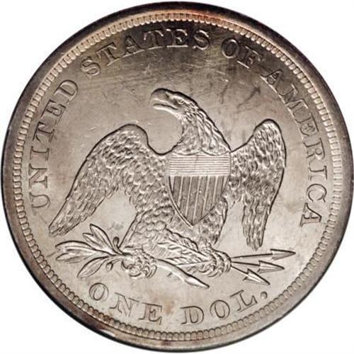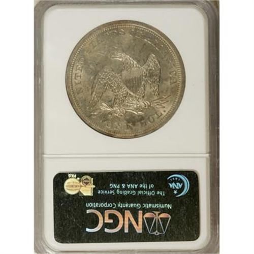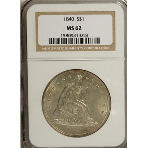 <B>1840 $1 MS62 NGC.</B></I> Christian Gobrecht designed the obverse of the new silver dollar design that debuted on a regular coinage issue in 1840. Well struck on all of the design elements, this rare Mint State example has semi-reflective fields that give the piece a dynamic, flashy appearance under the light. The pearl-gray surfaces show a few light splashes of russet color. A minor rim ding is observed on the reverse near 6 o'clock, as scattered small marks and pinscratches on each side also limit the grade. Just 61,005 pieces were struck, and survivors are scarce at all grade levels. Census: 13 in 62, 8 finer (6/07).<BR><BR><B>Coin Engraver:</B> Christian Gobrecht<BR><BR><b>Shipping:</b> Coins & Currency (<a target="_blank" href="http://www.heritageauctions.com/common/shipping.php">view shipping information</a>\)