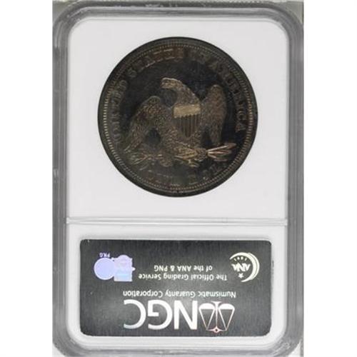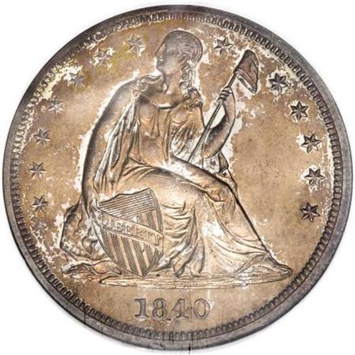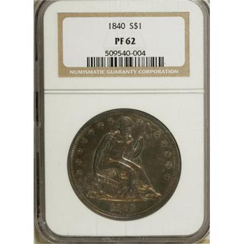 <B>1840 $1 PR62 NGC.</B></I> The majority of proof Seated dollars dated between 1840 and 1850 share a common reverse die identified by die chips or lumps on the final A in AMERICA. During his study of the proof Seated dollar series, Walter Breen described a shared reverse die, considering it a "restrike" die, used to produce a series of proof restrikes including coins dated throughout the 1840s. Current research suggests that Breen's explanation may be incorrect. During the 1840s and 1850s, common proof reverse dies are observed in several different denominations of copper, silver, and gold. It is now thought that the Mint created and preserved special dies intended solely for the production of proof coins, and that those coins should be classified as "originals."<BR> The 1840 provides an exception in that some proofs are known from a different reverse die, although the majority of 1840 proofs are from the shared die. The obverse of this coin displays several curved lathe lines on the shield beneath LIBERTY and the reverse has several die lines from the dentils over (STAT)ES O(F), characteristic of the second and rarer variety. The present specimen features deep apricot patina and is crisply struck. A strong lens is required to locate the few faint field hairlines. Census: 4 in 62, 18 finer (2/08).<BR><I>From The Queller Family Collection of Silver Dollars.</B></I><BR><BR><B>Coin Engraver:</B> Christian Gobrecht<BR><BR><b>Shipping:</b> Coins & Currency (<a target="_blank" href="http://www.heritageauctions.com/common/shipping.php">view shipping information</a>)