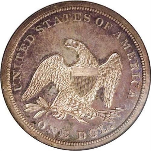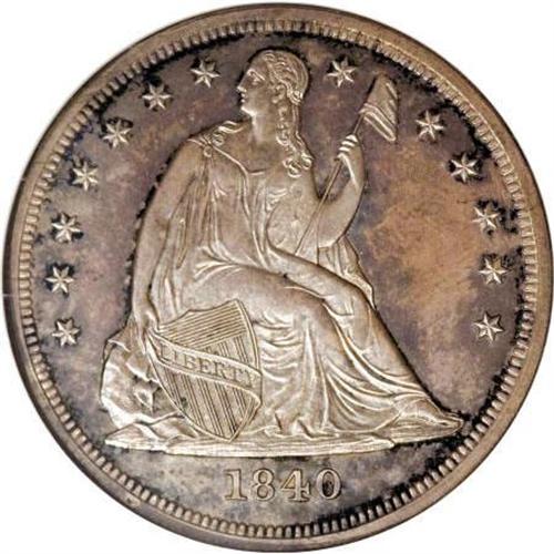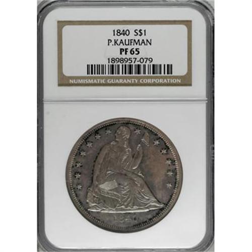 <B>1840 $1 Seated Dollar PR65 NGC.</B></I> Ex: P. Kaufman. Only a small number of proof 1840 Seated dollars are known, including this impressive Gem that ranks as one of the finest certified. Less than a dozen proofs are identified, and nearly all others are in lower numerical grades. This example is tied with one other piece for the best certified by NGC.<BR> Estimates of survival indicate that about 10 to 12 proof 1840 dollars are known, although the actual number may be slightly larger. David Akers suggested in the Pittman catalog that about 20 to 25 proofs were coined in 1840. We have not attempted a complete census, but a few of the better examples include the Pittman PR64 piece, the Amon Carter specimen, the Floyd Starr coin that is offered here, the Garrett Collection coin, and a PR64 example offered in our Morris Silverman sale. Some business strikes are known with fully prooflike fields, often cataloged as proofs in the past, making a census list difficult to construct. The same is true for certain other Seated dollars.<BR> The obverse has a short crack into the field from star 12 just above the inside point, not mentioned by Breen in his <I>Proof Encyclopedia</B></I> or by Bowers in his <I>Silver Dollar Encyclopedia</B></I>. The die crack appears on several proofs, and may be a further diagnostic to distinguish these pieces from prooflike business strikes. A common reverse die was used for the first decade of proof Seated dollars. Tiny lumps join the outside right diagonal of the final A in AMERICA, and these are seen on all years from 1840 through 1850. Some vertical shield lines extend into the horizontal crossbars above, another proof characteristic during these years. The use of common reverse dies for many proof coins of various denominations from copper to gold is well known among advanced numismatists. John Dannreuther and others have identified a number of these multi-year dies.<BR> Delightful proof mirrors are visible beneath medium gray, lilac, and iridescent toning, with splashes of darker toning along parts of the obverse border. Exceptional surfaces have few imperfections. Census: 2 in 65, 0 finer (6/07).<BR><I>Ex: Virgil M. Brand Collection; later, Q. David Bowers (5/5/1967); Floyd T. Starr Collection (Stack's, 10/1992), lot 580; Superior (7/1993), lot 552.<BR>From The Phil Kaufman Collection of Early Proof Sets, Part One.</B></I> (#6981)<BR><BR><BR><B>Coin Engraver:</B> Christian Gobrecht<BR><BR><b>Shipping:</b> Coins & Currency (<a target="_blank" href="http://www.heritageauctions.com/common/shipping.php">view shipping information</a>\)