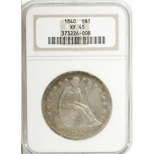 <B>1840 $1 XF45 NGC.</B></I> NGC Census: (21/122). PCGS Population (34/117). Mintage: 61,005. Numismedia Wsl. Price for NGC/PCGS coin in XF45: $524. (#6926)<BR><BR><B>Coin Engraver:</B> Christian Gobrecht<BR><BR><b>Shipping:</b> Coins & Currency (<a target="_blank" href="http://www.heritageauctions.com/common/shipping.php">view shipping information</a>)