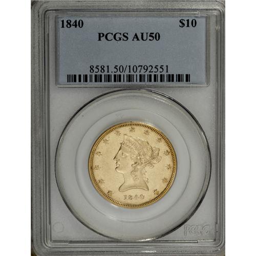 <B>1840 $10 AU50 PCGS.</B></I> Despite light, even wear, the amber-gold fields retain a degree of reflectivity. Well struck with numerous handling marks in the fields. Population: 15 in 50, 20 finer (1/07).<BR><BR><b>Shipping:</b> Coins & Currency (<a target="_blank" href="http://www.heritageauctions.com/common/shipping.php">view shipping information</a>)