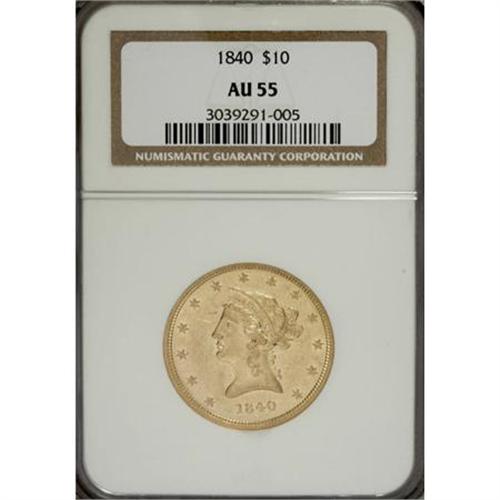 <B>1840 $10 AU55 NGC.</B></I> Despite a degree of light, even wear, this lemon-gold piece retains significant luster that hints at past reflectivity. The strike is pleasing overall, though the obverse stars show a trace of softness. Light, scattered abrasions have little effect on the overall eye appeal. Census: 19 in 55, 19 finer (3/08).<BR><BR><B>Coin Engraver:</B> Christian Gobrecht<BR><BR><b>Shipping:</b> Coins & Currency (<a target="_blank" href="http://www.heritageauctions.com/common/shipping.php">view shipping information</a>)