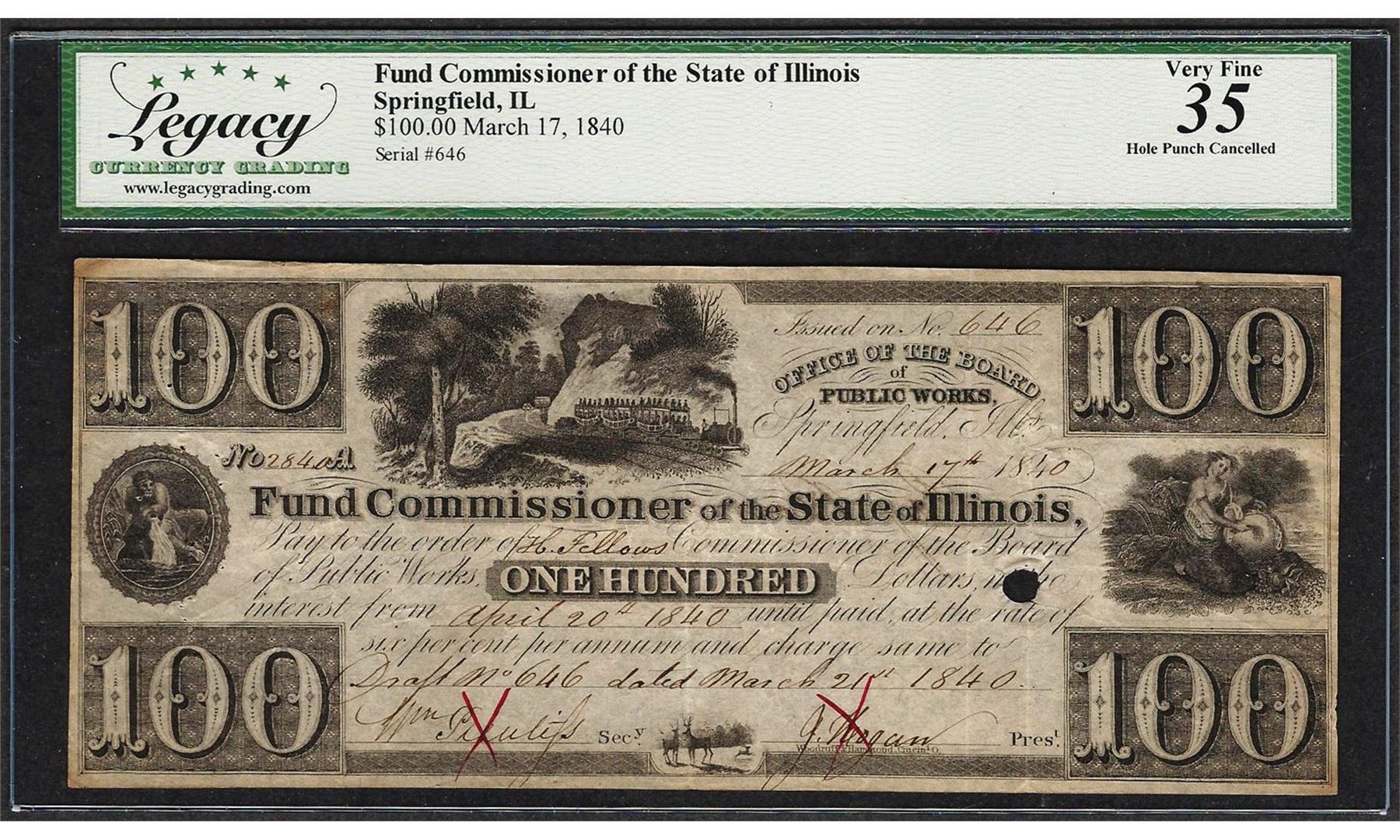 One 1840 $100 Fund Commissioner of the State of Illinois Obsolete Note Legacy Very Fine 35. Legacy Graded.