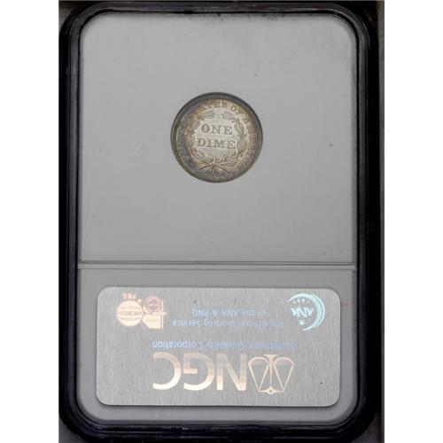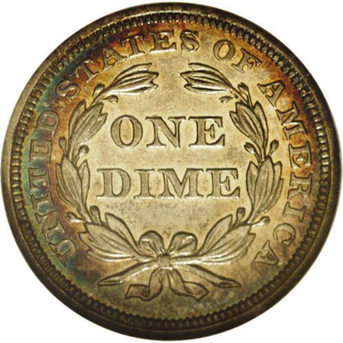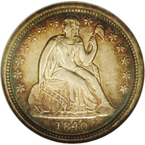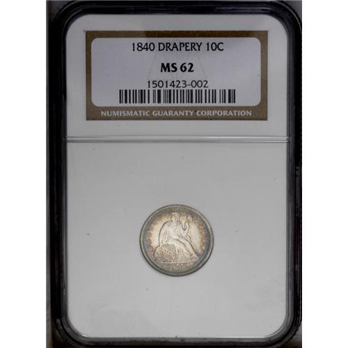 <B>1840<10C> Drapery MS62 NGC.</B></I> A prize for the advanced collector as few examples are so nicely struck. The head details on the obverse and the ribbon bow on the reverse are especially sharp. Light gray surfaces are framed by peripheral blue and russet color. Specialist Gerry Fortin commented on www.seateddimevarieties.com: "In Mint State, this date is very underrated as few examples are known." Census: 2 in 62, 3 finer (3/06).<BR><I>Ex: Newcomb Collection; Milton A. Holmes Collection (Stack's, 10/60), lot 2734.</B></I>