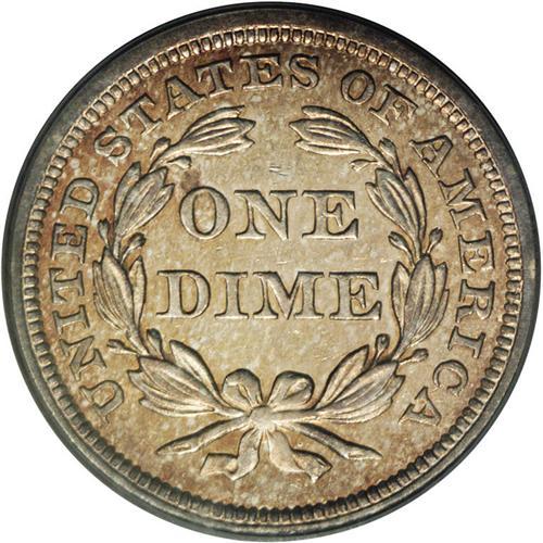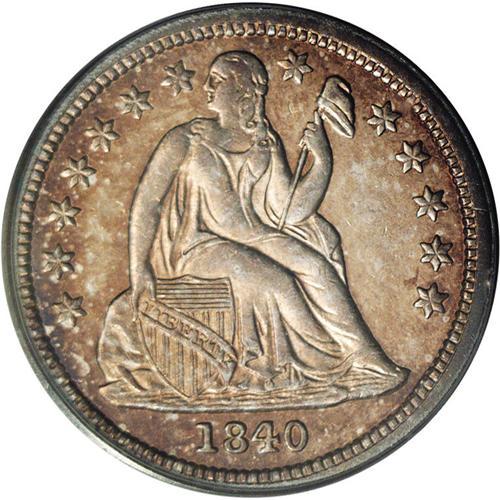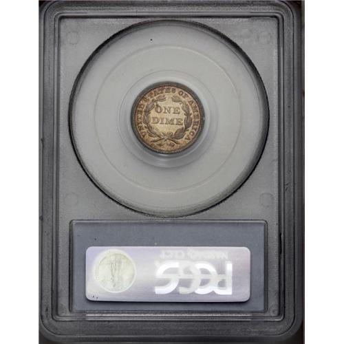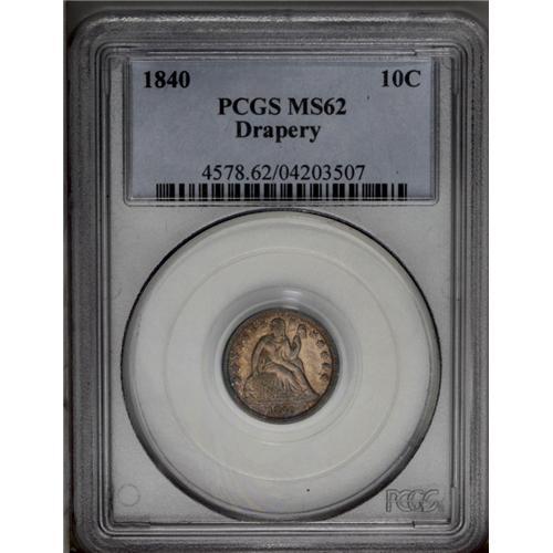 <B>1840<10C> Drapery MS62 PCGS.</B></I> A difficult issue at all grade levels and a premier rarity among Uncirculated Seated Liberty dimes, the 1840 Drapery dime is indeed an important and seldom offered date. The surfaces on this prized Uncirculated specimen are fully prooflike, showing watery brilliance with an abundant amount of reddish-russet toning over each side that deepens slightly at the borders. The strike is reasonably sharp, with only a touch of softness on Liberty's head and on the bow at the base of the wreath. A number of small field marks overall seem to limit the grade. Population: 1 in 62, 4 finer (3/06).