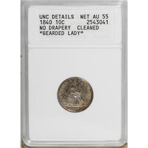 <B>1840 10C No Drapery--Cleaned-ANACS. Unc Details, Net AU55. </B></I>"Bearded Lady."<B> </B></I>NGC Census: (3/84). PCGS Population (5/55). Mintage: 981,500. Numismedia Wsl. Price for NGC/PCGS coin in AU55: $171. (#4573)<BR><BR><B>Coin Engraver:</B> Christian Gobrecht<BR><BR><b>Shipping:</b> Coins & Currency (<a target="_blank" href="http://www.heritageauctions.com/common/shipping.php">view shipping information</a>)