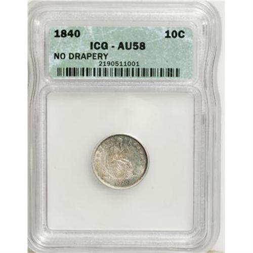 <B>1840 10C No Drapery AU58 ICG.</B></I> NGC Census: (11/72). PCGS Population (10/47). Mintage: 981,500. Numismedia Wsl. Price for NGC/PCGS coin in AU58: $208. (#4573)<BR><BR><B>Coin Engraver:</B> Christian Gobrecht<BR><BR><b>Shipping:</b> Coins & Currency (<a target="_blank" href="http://www.heritageauctions.com/common/shipping.php">view shipping information</a>)