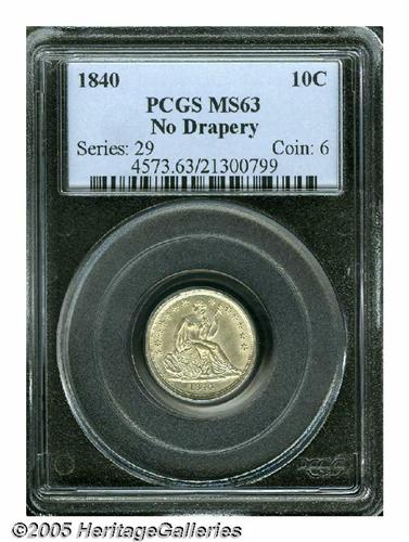 <B>1840<10C> No Drapery MS63 PCGS.</B></I> Fortin-104. The obverse die is shattered with prominent cuds and cracks, as made. Scintillating luster sweeps over this unmarked and exquisitely struck Seated Dime. A transitional year for the design, the Drapery type was introduced in 1840.<BR><I>From The Tim Cook Collection of Liberty Seated Dimes.</B></I>