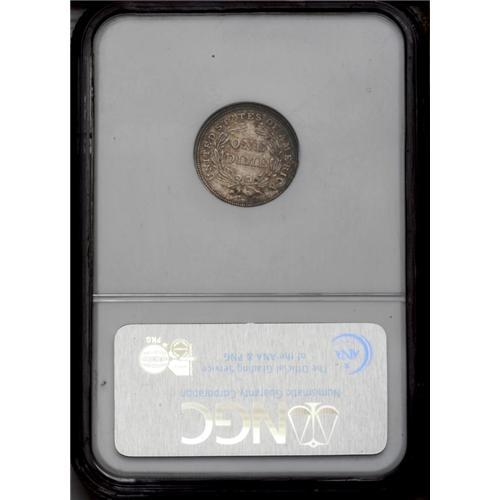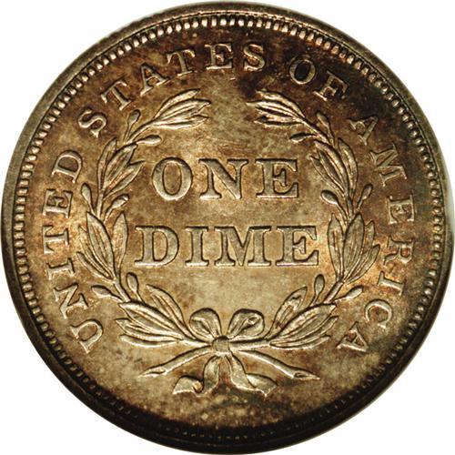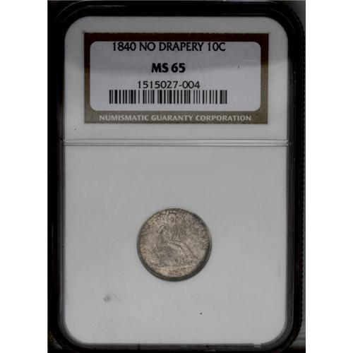 <B>1840<10C> No Drapery MS65 NGC.</B></I> The obverse of this briefly minted type displays Christian Gobrecht's original design for the Seated Liberty dime, a fact that should endear this coin to both Seated coin specialists and type collectors alike. The 1840 No Drapery is easily the most challenging of the three P-mint issues of the design at the Gem level. This lustrous example displays characteristic exactness of strike and an abundant mottled overlay of lilac-gray and russet toning. Census: 8 in 65, 11 finer (3/06).