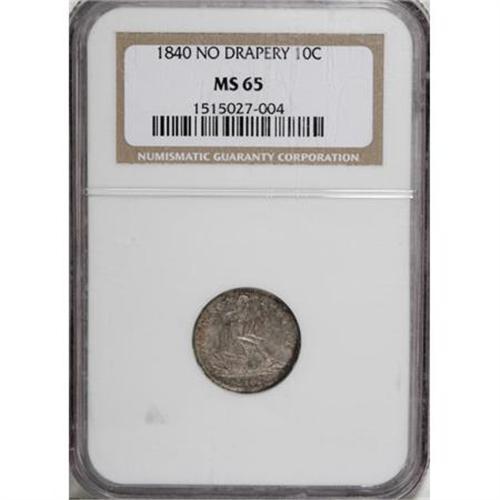 <B>1840 10C No Drapery MS65 NGC.</B></I> The obverse of this briefly minted type displays Christian Gobrecht's original design for the Seated Liberty dime, a fact that should endear this coin to both Seated coin specialists and type collectors alike. The 1840 No Drapery is easily the most challenging of the three P-mint issues of the design at the Gem level. This lustrous example displays characteristic exactness of strike and an abundant mottled overlay of lilac-gray and russet toning. Census: 11 in 65, 13 finer (6/07).<BR><BR><B>Coin Engraver:</B> Christian Gobrecht<BR><BR><b>Shipping:</b> Coins & Currency (<a target="_blank" href="http://www.heritageauctions.com/common/shipping.php">view shipping information</a>\)