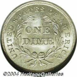<table><tr><td><table><tr><td>1840 10C No Drapery MS66 NGC. The No Drapery, Stars Obverse subtype of the Seated dime was used at the Philadelphia Mint for only three years, 1838-1840. The 1840 boasts the lowest mintage of this trio with 981,500 pieces and, while somewhat available in lower grades, this issue is a prime rarity in Gem condition. This silver-gray example is sharply struck throughout with a rich endowment of mint frost. Distraction-free and appealing, this coin belongs in a high quality type set. Population: 8 in 66, 3 finer (3/04). <BR><BR><B>Important notice:</B> Heritage usually auctions material at the rate of 200-250 lots per hour. On some occasions eBay Live bid software or the Internet may not be able to keep up with the pace of the auction. We recommend placing a realistic absentee bid now as insurance to avoid disappointment. Occasionally the auctioneer may eliminate or reject an eBay Live bid, and the auctioneer may also reopen a lot after the close of the eBay live bidding (usually because we missed an audience bid), and may reject your bid even if it shows you as the winning bidder. By bidding via eBay Live, you agree that Heritage may award the lot to another bidder at its sole discretion under the circumstances described above or any other reasonable circumstances. Since eBay bids are not shown to us until we open the lot on the floor, we treat those bids just like floor bids. In most cases the floor responds before the eBay bid is presented to us, due to Internet lag time, so for consistency we have made it a policy that floor bids are always considered first over tie eBay live bids. Also please note that all Heritage lots purchased through eBay Live carry a 20% Buyer's Premium. Please make sure you read the Terms and Conditions before you bid. <BR><BR><B>IMPORTANT ANNOUNCEMENT ABOUT RESERVES:</B> Heritage now divulges all reserves on its web site 7 days before every auction. If you want to know whether the reserve on this lot has been met, and if not, what the reserve amount is, please visit this lot page on the HeritageCoin.com web site, or email: bid@HeritageGalleries.com </span></font></td></tr></table></td></tr></table>