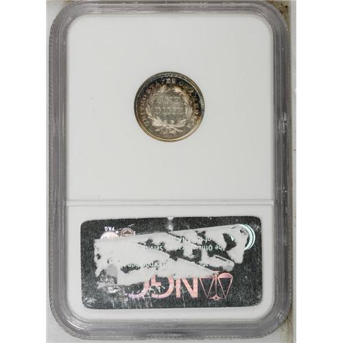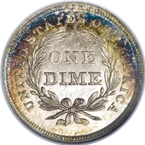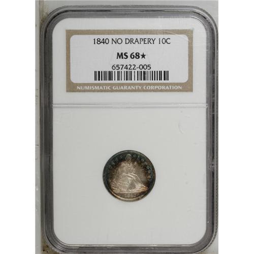 <B>1840<10C> No Drapery MS68 <img border='0' src='http://www.heritagecoins.com/images/star.gif' width=10 height=10> NGC.</B></I> The With Stars Dimes of 1838-1840 are a distinctive type that lack the drapery from Liberty's elbow as seen on later issues. Of the three years this type was issued, the 1840 has the lowest official mintage with only 981,500 pieces struck. It is available in lower grades, but Gem and finer examples are very rare. This particular piece is fully struck in all areas and exhibits a partially reflective appearance in the fields. Deep cobalt-blue and reddish-russet toning enhances the peripheries. The centers are essentially brilliant. A hair-thin mark between the upper wreath ends denies perfection. The Star designation, indicating superior eye appeal, is awarded to few coins of any grade. Census: 1 in 68 <img border='0' src='http://www.heritagecoins.com/images/star.gif' width=10 height=10>, 0 finer (9/06).