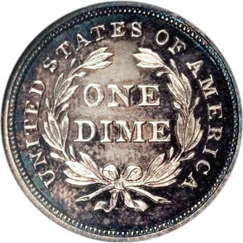 <B>1840 10C No Drapery Dime PR65 Cameo NGC.</B></I> Ex: P. Kaufman. The original mintage of the proof 1840 No Drapery dimes is unknown, although certainly quite small. Only five or six pieces are known today, including the Kaufman Gem Cameo proof, the finest example known to us. Many important cabinets offered in recent years have lacked this date in proof, including the Garrett, Norweb, and Lovejoy collections. Four of the known examples are listed in our roster of survivors: <BR><B><BR>1. PR65 Cameo NGC.</B></I> <B>The present coin.</B></I> <I>Kaufman Collection.</B></I> This piece does not appear to match any of the following.<BR><B><BR>2.</B></I> <B>PR65 NGC.</B></I> <I>Allenburger Collection (B. Max Mehl, 3/1948), lot 985; John Jay Pittman (David Akers, 10/1997), lot 586; Bowers and Merena (8/1999), lot 104; Richmond Collection (David Lawrence, 3/2005), lot 1235.</B></I> <BR><B><BR>3.</B></I> <B>PR64 NGC.</B></I> <I>Heritage (10/2001), lot 6028.</B></I> This piece is identified in the catalog as the Eliasberg specimen, although the plates do not match.<BR><B><BR>4.</B></I> <B>PR63.</B></I> <I>Louis E. Eliasberg, Sr. (Bowers, 5/1996), lot 1117.<BR></B></I><BR> Like the 1840 proof half dime, the interior space of the 4 crowds the thin, flat top of this digit. Star 2 is minutely repunched, although there is no apparent recutting on any other star. A faint horizontal die line pierces the top of Liberty's head. The reverse has a few short, diagonal spines from the border over OF, and both sides have faint die polish lines. The Eliasberg specimen shows these identical characteristics, and the others probably do as well. David Akers points out that the reverse spines over OF are diagnostic for proofs of this issue.<BR> Brilliant centers are graced by light champagne color and framed by pale lilac and vivid blue. NGC has assigned a Cameo designation to memorialize the remarkable contrast between the fields and devices. Census: 3 in 65 Cameo, 0 finer (7/07).<BR><I>From The Phil Kaufman Collection of Early Proof Sets, Part One.</B></I> (#84724)<BR><BR><BR><b>Shipping:</b> Coins & Currency (<a target="_blank" href="http://www.heritageauctions.com/common/shipping.php">view shipping information</a>)