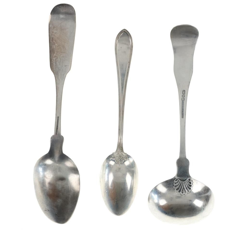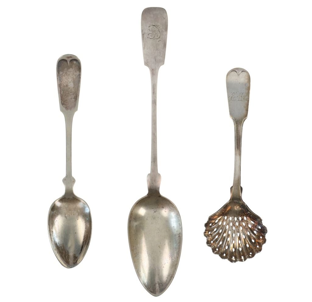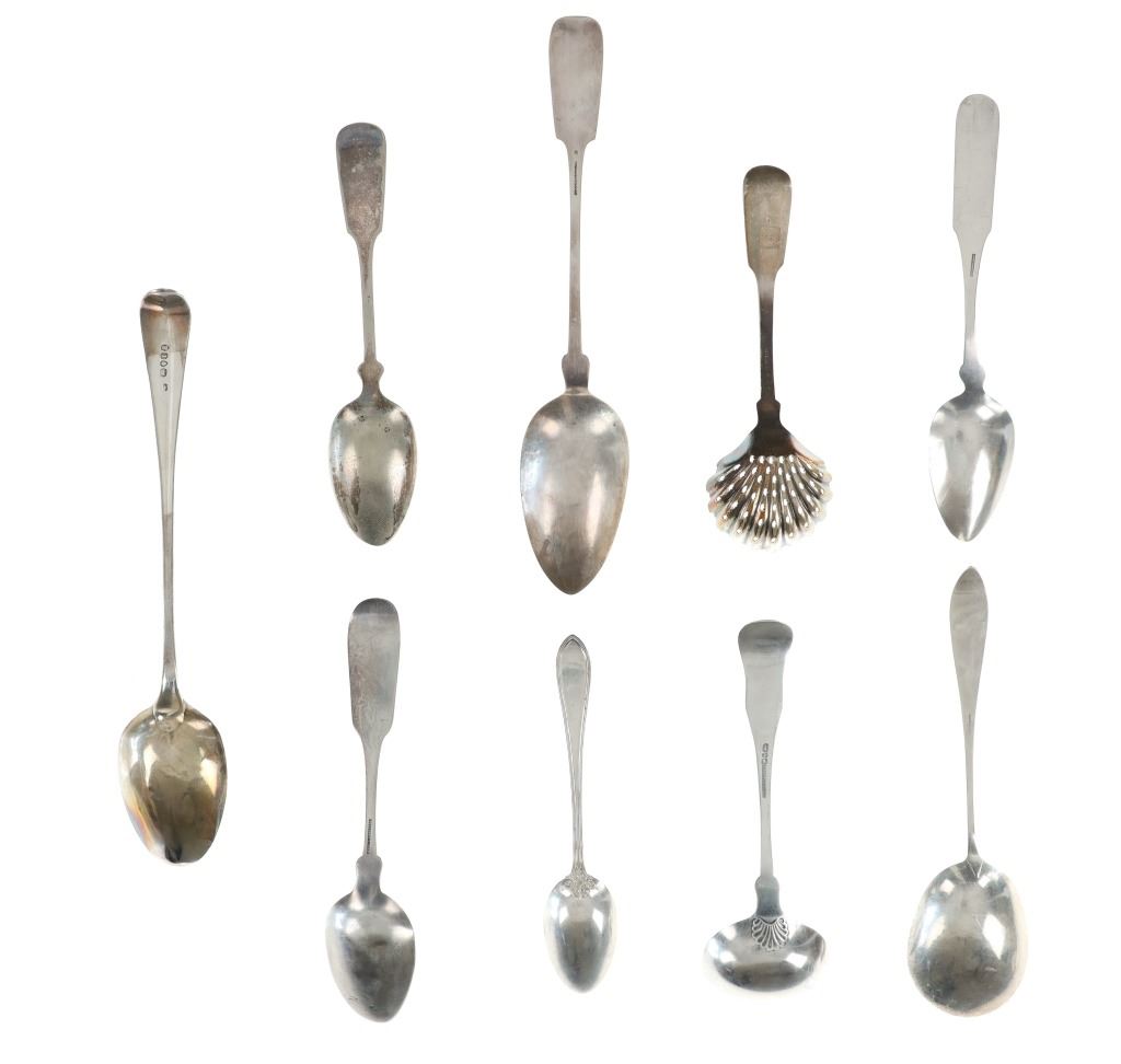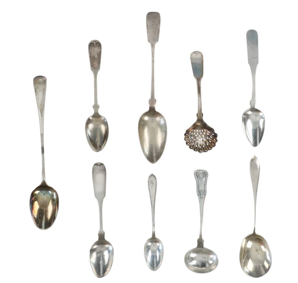 For your consideration are nine marked sterling spoons from various makers circa 1870-1910s. The first and largest spoon in this collection was made by S. Hennell in London, England circa 1805-05. The makers mark was present but has since been worn down. The neck of the spoon is long and slim and features stampings on the back of the neck showing the makers mark, a lion passant indicating the quality of the sterling, the town mark of London, a letter "I" indicating the year it was made (1804) and a right facing kings head showing it was made under the rule of King George III. The spoon shows no stamped or embossed designs. The second sterling spoon is attributed to 1852 Redfield & Rice or 1847 Rogers Bros. The spoon features stampings on the back of the neck showing the makers mark, "Y & T" as well as an eagle effigy with its wings spread stamped next to the makers mark. The spoon shows a deep gold washed bowl with small openings for draining any liquid acquired while scooping. The top of the handle shows initials reading "EML". The third spoon in this collection was made by Stebbins & Howe in New York circa 1830-32. By the end of 1829, Edwin Stebbins had relocated from Springfield, Massachusetts to New York City in order to open a jewelry store on Chatham Street. On that same street, he co-owned a business with George Howe from 1831 to 1834, but by 1834 or 1835, he had ended their partnership and had relocated to 264 Broadway. The spoon shows a detailed handle featuring initials reading, "BHR", while the back of the neck shows stampings and the makers mark reading, "Stebbins & Howe". The next spoon in this collection was made in New Orleans circa 1840-50s by Hyde & Goodrich. James N. Hyde spent a few years working in New York before opening a New Orleans location for his retail operation in 1817. Within the following ten years, his brother-in-law Charles Whiting Goodrich joined him in business in New Orleans. By 1828, the first Hyde & Goodrich store was situated on Chartres Street, but in 1853 it was relocated to the intersection of Canal and Royal Streets. However, selling upscale imported goods like patented pistols, pens, watches, and flatware from northeastern and European producers accounted for the majority of Hyde & Goodrich's business. The spoon features a polished coin silver construction with no designs present. The back of the neck shows the makers mark reading, "Hyde & Goodrich". The fifth spoon in this collection is attributed to a silversmith in Holland due to the stamping on the back of the neck. The spoon shows a simple line design on the outer edge of the handle with an "S" on the top of the handle. The back of the neck reads, "Sterling" with the Holland stamp to the left of it. The sixth spoon in this collection was made in Birmingham, England circa 1880-1900s. The spoon features a polished sterling construction with stampings on the back of the neck reading "Sterling" and show a lion passant indicating the quality of the silver, and the town mark of Birmingham. The bowl is large and wide while the neck goes from skinny to wide and flat towards the top. The seventh spoon in this collection once showed a makers mark but has since been stamped out. The spoon is large and features a long handle and large, wide bowl. The top of the handle shows initials reading, "FJ". The back of the neck shows the stamped out makers mark as well as a small, unidentifiable stamp. The eighth spoon in this lot once showed a makers mark but has since been worn off from its age and use over the years. The spoon features a polished sterling construction with no designs present. The ninth and final spoon in this collection was made by Edward Comfort Newbury circa 1840-1860s in Brooklyn, Connecticut. Edward was born August 24th, 1799 in Mansfield Center, Connecticut. He apprenticed around 1814 in Hartford, Connecticut and worked as a silversmith in Brooklyn, Connecticut from 1828 to 1860. He appeared on the 1860 census taken at Brooklyn CT, listed as a spectacle maker, and by the 1870 census he had set aside his trade and was working as a florist. The spoon shows the makers mark on the back of the neck reading, "E. Newbury" while the top of the handle shows initials reading, "CML". The spoons in this collection show good condition overall with some wear and light patinas from their age and use over the years. No obvious signs of damage are present on the spoons. The spoons measure from 11 5/16" L x 2 1/8" W to 7" L x 1 7/16" W. The collective weight of the spoons is 513.4 grams.