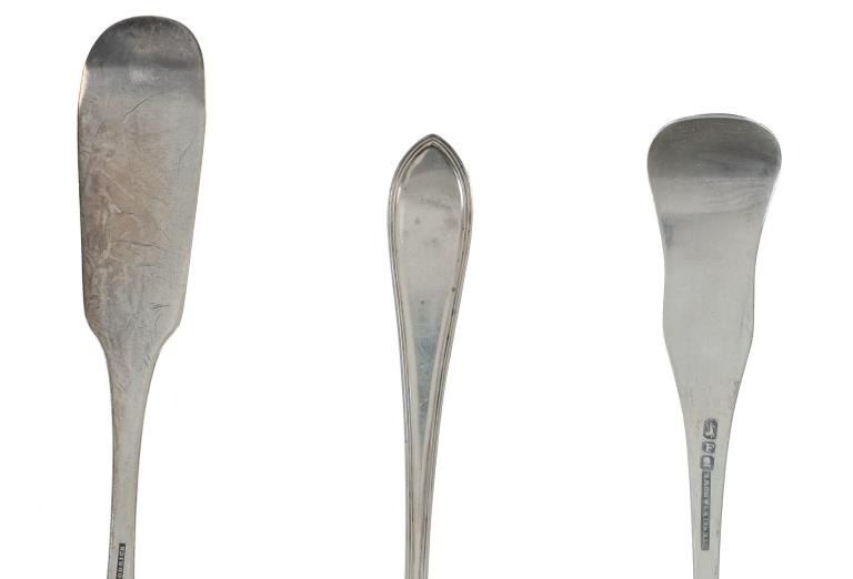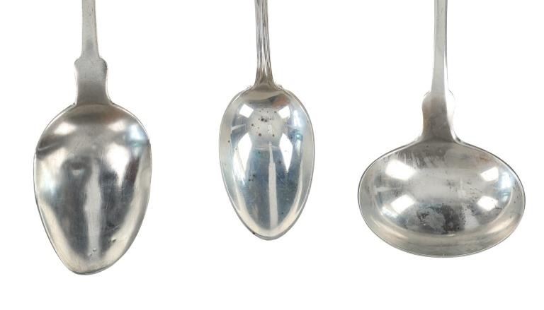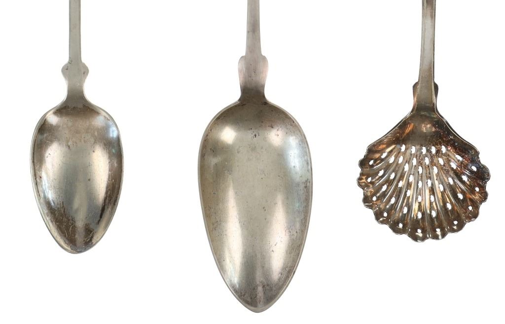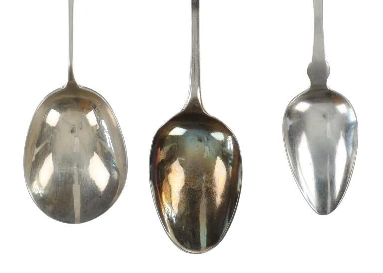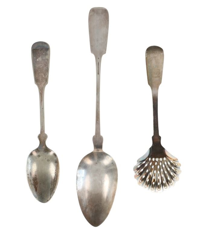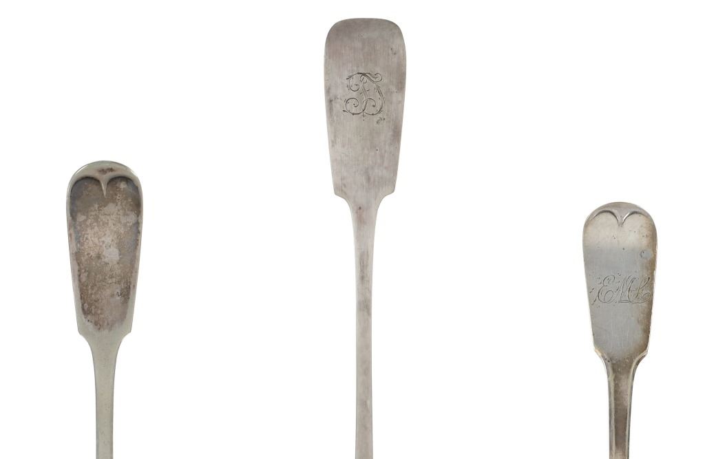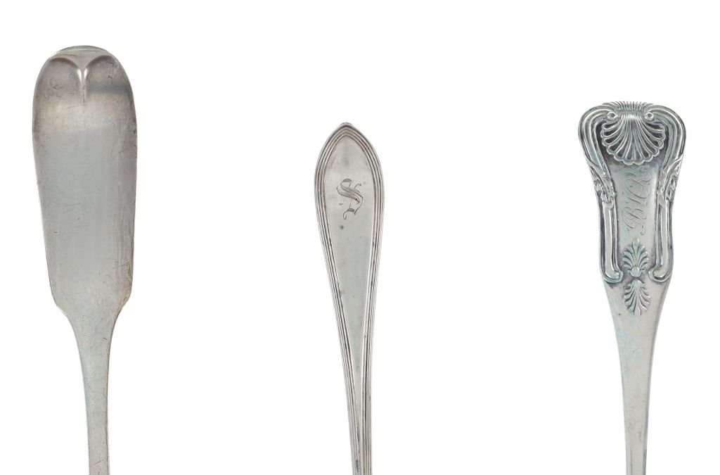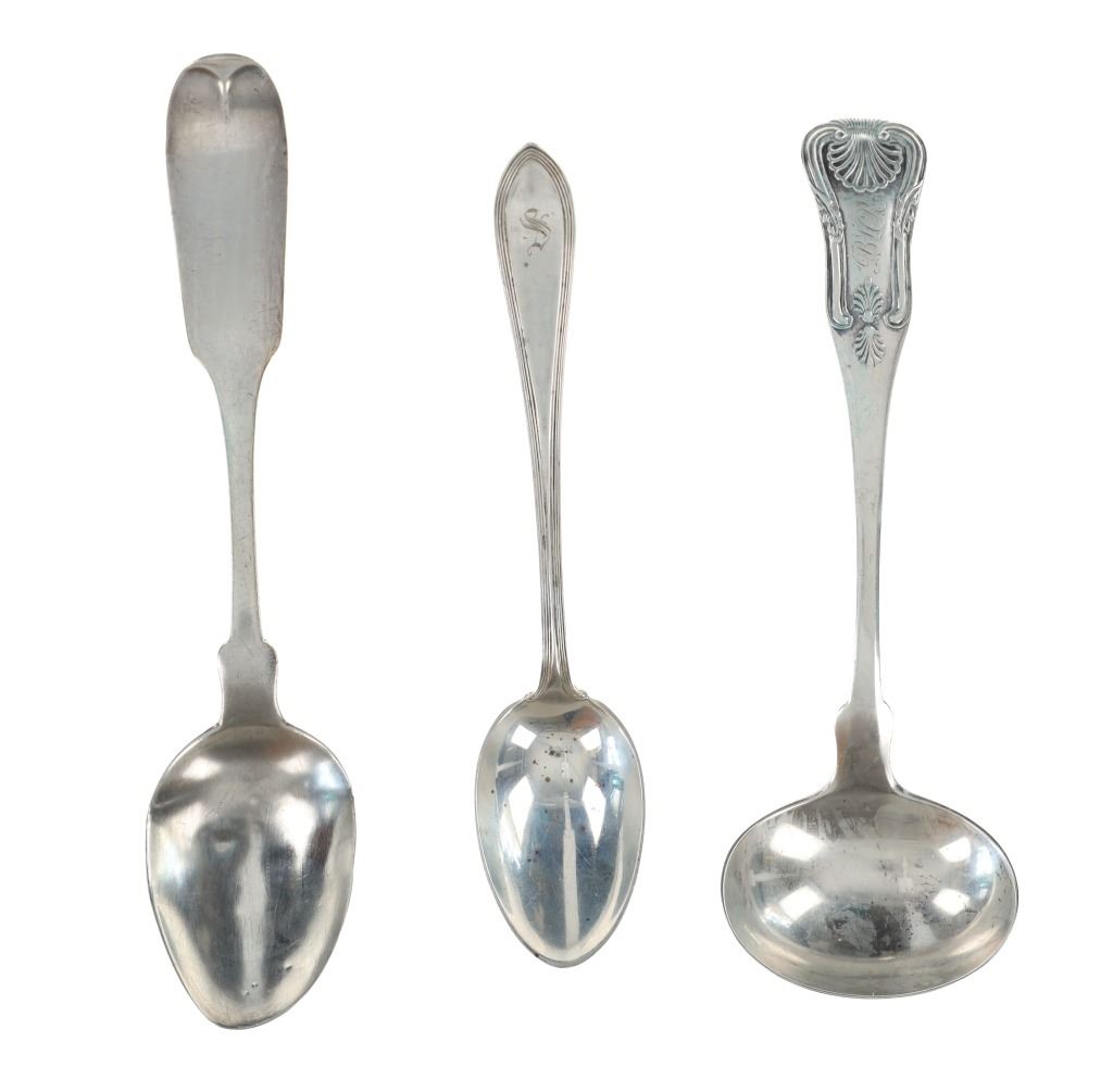 For your consideration are nine marked sterling spoons from various makers circa 1870-1910s. The first and largest spoon in this collection was made by S. Hennell in London, England circa 1805-05. The makers mark was present but has since been worn down. The neck of the spoon is long and slim and features stampings on the back of the neck showing the makers mark, a lion passant indicating the quality of the sterling, the town mark of London, a letter "I" indicating the year it was made (1804) and a right facing kings head showing it was made under the rule of King George III. The spoon shows no stamped or embossed designs. The second sterling spoon is attributed to 1852 Redfield & Rice or 1847 Rogers Bros. The spoon features stampings on the back of the neck showing the makers mark, "Y & T" as well as an eagle effigy with its wings spread stamped next to the makers mark. The spoon shows a deep gold washed bowl with small openings for draining any liquid acquired while scooping. The top of the handle shows initials reading "EML". The third spoon in this collection was made by Stebbins & Howe in New York circa 1830-32. By the end of 1829, Edwin Stebbins had relocated from Springfield, Massachusetts to New York City in order to open a jewelry store on Chatham Street. On that same street, he co-owned a business with George Howe from 1831 to 1834, but by 1834 or 1835, he had ended their partnership and had relocated to 264 Broadway. The spoon shows a detailed handle featuring initials reading, "BHR", while the back of the neck shows stampings and the makers mark reading, "Stebbins & Howe". The next spoon in this collection was made in New Orleans circa 1840-50s by Hyde & Goodrich. James N. Hyde spent a few years working in New York before opening a New Orleans location for his retail operation in 1817. Within the following ten years, his brother-in-law Charles Whiting Goodrich joined him in business in New Orleans. By 1828, the first Hyde & Goodrich store was situated on Chartres Street, but in 1853 it was relocated to the intersection of Canal and Royal Streets. However, selling upscale imported goods like patented pistols, pens, watches, and flatware from northeastern and European producers accounted for the majority of Hyde & Goodrich's business. The spoon features a polished coin silver construction with no designs present. The back of the neck shows the makers mark reading, "Hyde & Goodrich". The fifth spoon in this collection is attributed to a silversmith in Holland due to the stamping on the back of the neck. The spoon shows a simple line design on the outer edge of the handle with an "S" on the top of the handle. The back of the neck reads, "Sterling" with the Holland stamp to the left of it. The sixth spoon in this collection was made in Birmingham, England circa 1880-1900s. The spoon features a polished sterling construction with stampings on the back of the neck reading "Sterling" and show a lion passant indicating the quality of the silver, and the town mark of Birmingham. The bowl is large and wide while the neck goes from skinny to wide and flat towards the top. The seventh spoon in this collection once showed a makers mark but has since been stamped out. The spoon is large and features a long handle and large, wide bowl. The top of the handle shows initials reading, "FJ". The back of the neck shows the stamped out makers mark as well as a small, unidentifiable stamp. The eighth spoon in this lot once showed a makers mark but has since been worn off from its age and use over the years. The spoon features a polished sterling construction with no designs present. The ninth and final spoon in this collection was made by Edward Comfort Newbury circa 1840-1860s in Brooklyn, Connecticut. Edward was born August 24th, 1799 in Mansfield Center, Connecticut. He apprenticed around 1814 in Hartford, Connecticut and worked as a silversmith in Brooklyn, Connecticut from 1828 to 1860. He appeared on the 1860 census taken at Brooklyn CT, listed as a spectacle maker, and by the 1870 census he had set aside his trade and was working as a florist. The spoon shows the makers mark on the back of the neck reading, "E. Newbury" while the top of the handle shows initials reading, "CML". The spoons in this collection show good condition overall with some wear and light patinas from their age and use over the years. No obvious signs of damage are present on the spoons. The spoons measure from 11 5/16" L x 2 1/8" W to 7" L x 1 7/16" W. The collective weight of the spoons is 513.4 grams.