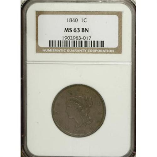 <B>1840 1C Large Date MS63 Brown NGC.</B></I> N-5, R.1. Grellman Die State c with slender obverse rim cuds. Glimpses of mint gold illuminate the reverse border, but the piece is primarily medium brown. The reverse has faint retained laminations across the center between 10 and 4 o'clock, and a partially retained lamination is noted above the portrait. EAC 50.<BR><BR><B>Coin Engraver:</B> Christian Gobrecht<BR><BR><b>Shipping:</b> Coins & Currency (<a target="_blank" href="http://www.heritageauctions.com/common/shipping.php">view shipping information</a>)