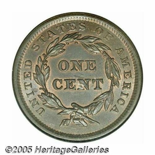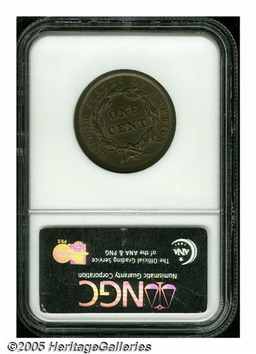 <B>1840<1C> Large Date MS66 Brown NGC.</B></I> N-8, R.1. A magnificently preserved and exactingly struck premium Gem, certain to be treasured by the dedicated specialist. Glimpses of original orange color outline protected areas, while smooth and consistent ebony color fills the fields and portrait. Newcomb-8 is best identified by the series of heavy 'cuds' or die breaks (as produced) along the left and lower obverse rim.<BR><I>From The Clifford Columbus Collection.</B></I>